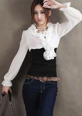 Элегантная корсетная строгая блузка с длинными рукавами и рюшами на вороте - удивительное сочетание строгости и женственности. Это модель отлично сочетается как с юбками, так и брюками. Классический приталенный силуэт удачно сочетается с рюшевым воротом, что делает эту блузку необычной и ультрамодной. Имитация корсета подчеркивает стройность фигуры а также придает груди дополнительный объем. Блуза представлена в черном и белом цвете.